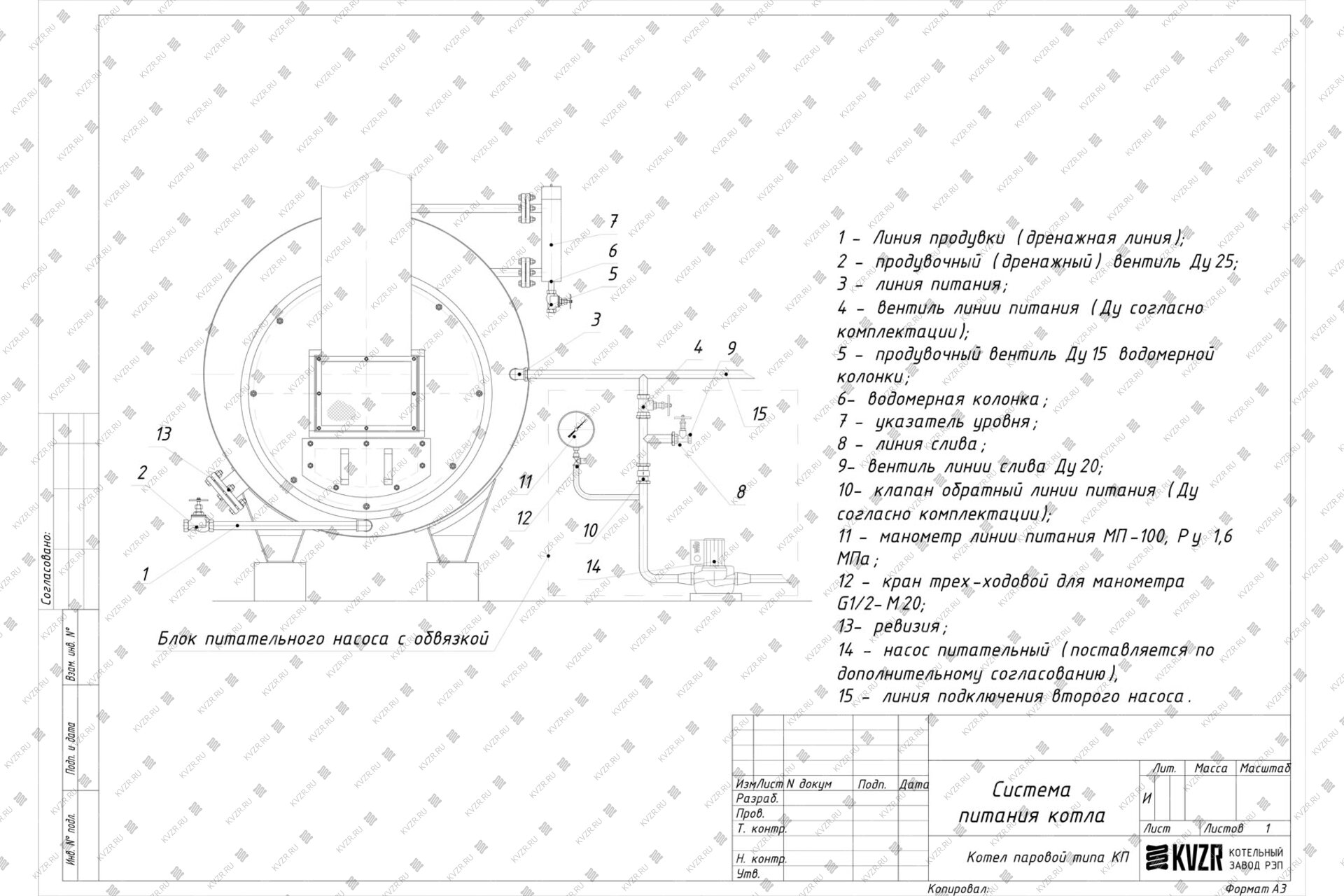 Подпитка котла ведется из питательного бака через насос, соединительную арматуру. На трубопроводе подпитки котла водой должно быть установлено запорное устройство и обратный клапан. Запорное устройство должно располагаться между котлом и обратным клапаном.