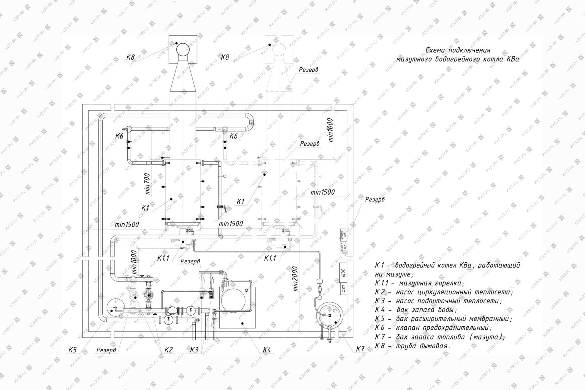 Чтобы правильно подключить котел 0.4 МВт на мазуте в котельной необходимо оставить проемы для обслуживания оборудования во время эксплуатации. На представленной здесь схеме указаны их минимальные размеры. Кроме того, в данной примерной схеме монтажа водогрейных котлов и оборудования указан перечень минимально необходимого вспомогательного оборудования для правильной работы котла.