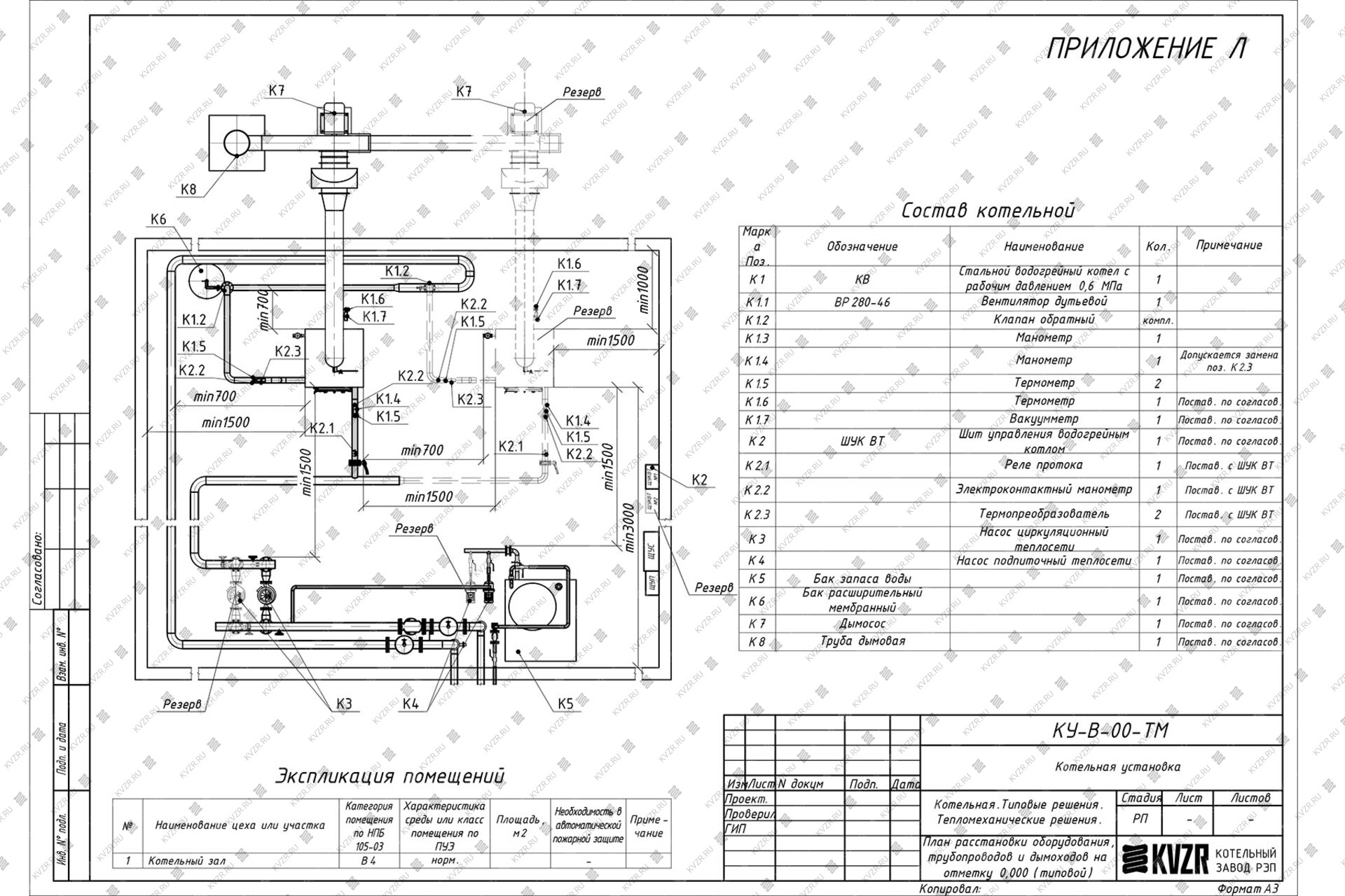 Чтобы правильно подключить котел КВ-0.15 без дымососа на самотяге в котельной необходимо оставить проемы для обслуживания оборудования во время эксплуатации. На представленной здесь схеме указаны их минимальные размеры. Кроме того, в данной примерной схеме монтажа водогрейных котлов и оборудования указан перечень минимально необходимого вспомогательного оборудования для правильной работы котла.