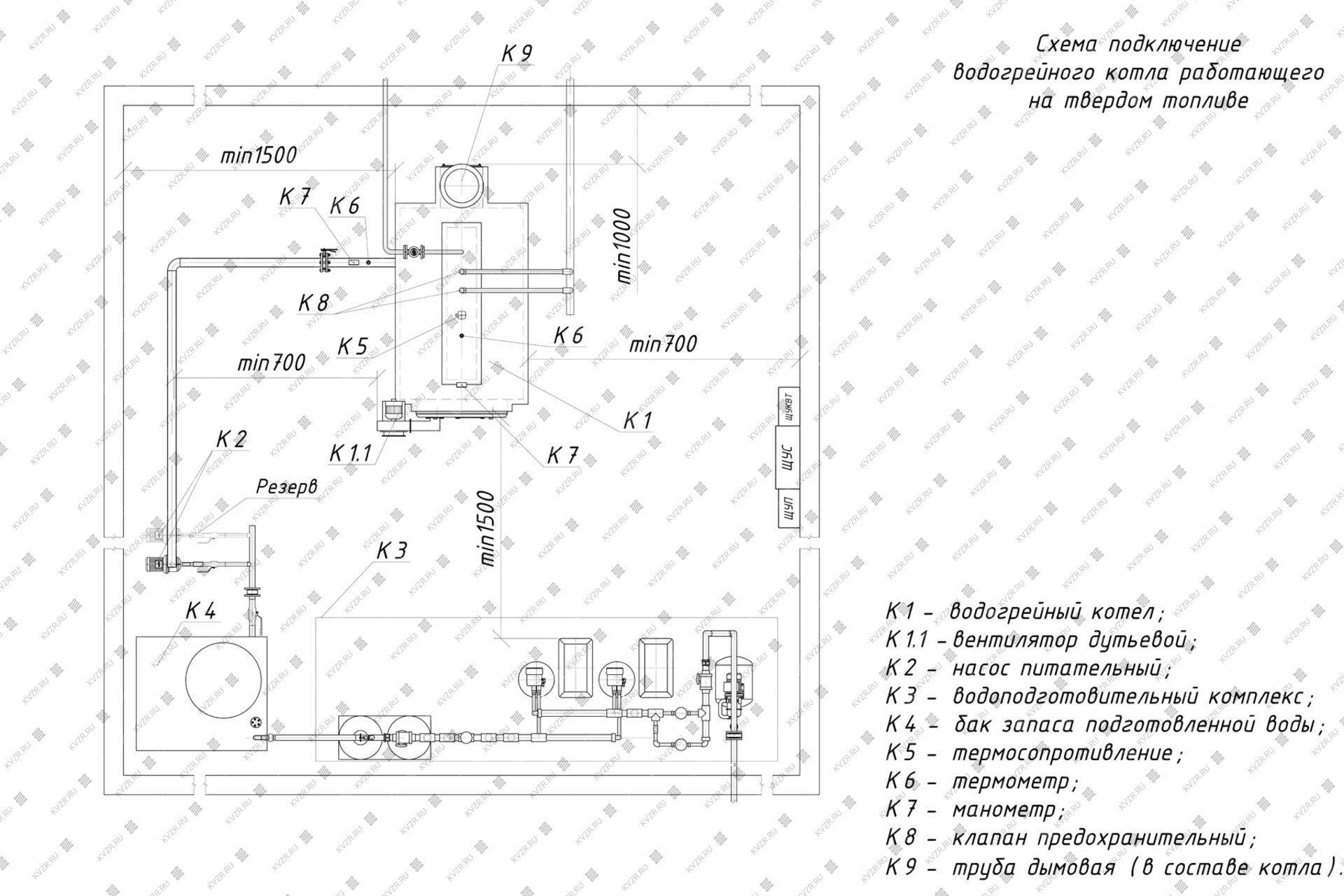 Чтобы правильно подключить котел КВ 1000 в котельной необходимо оставить проемы для обслуживания оборудования во время эксплуатации. На представленной здесь схеме указаны их минимальные размеры. Кроме того, в данной примерной схеме монтажа водогрейных котлов и оборудования указан перечень минимально необходимого вспомогательного оборудования для правильной работы котла.